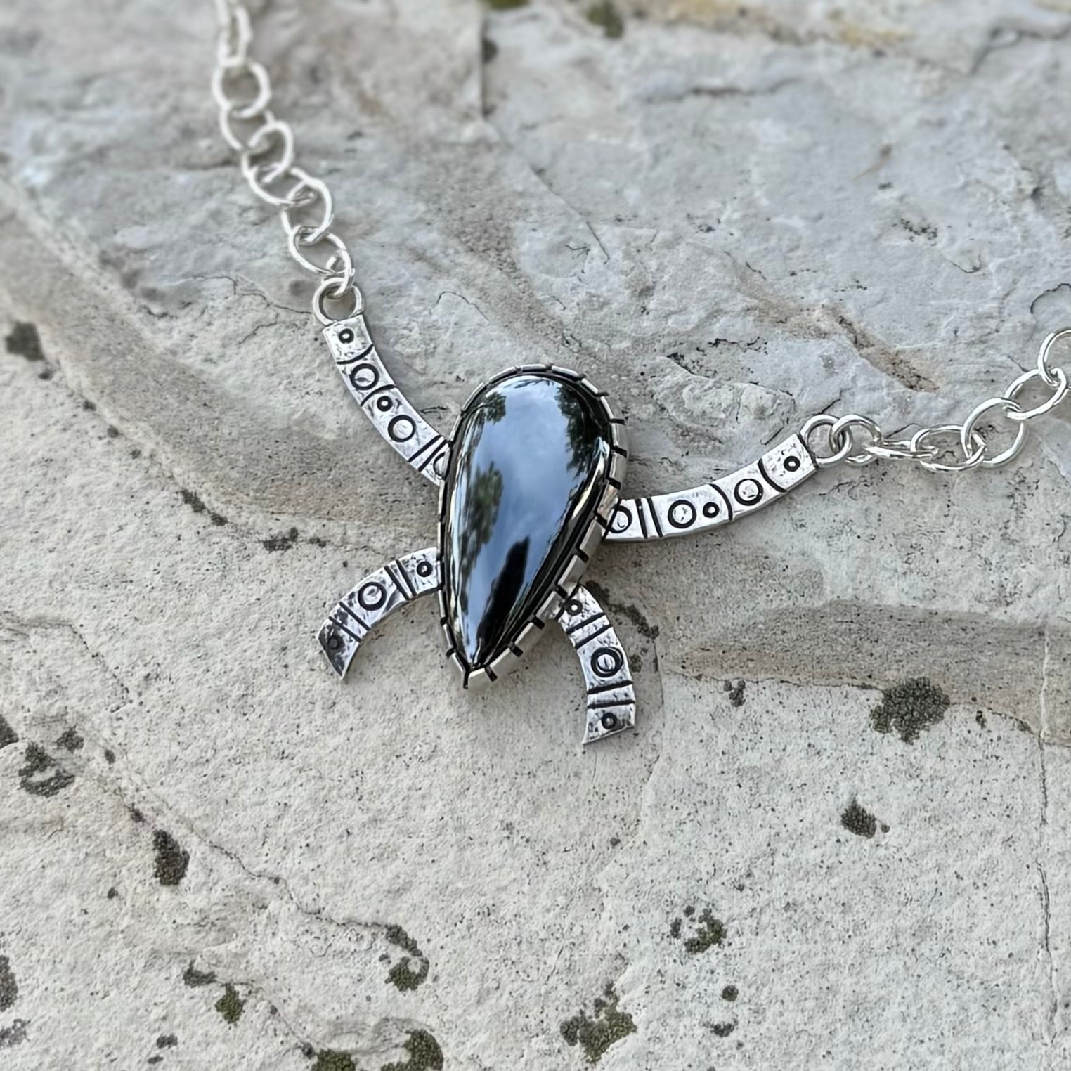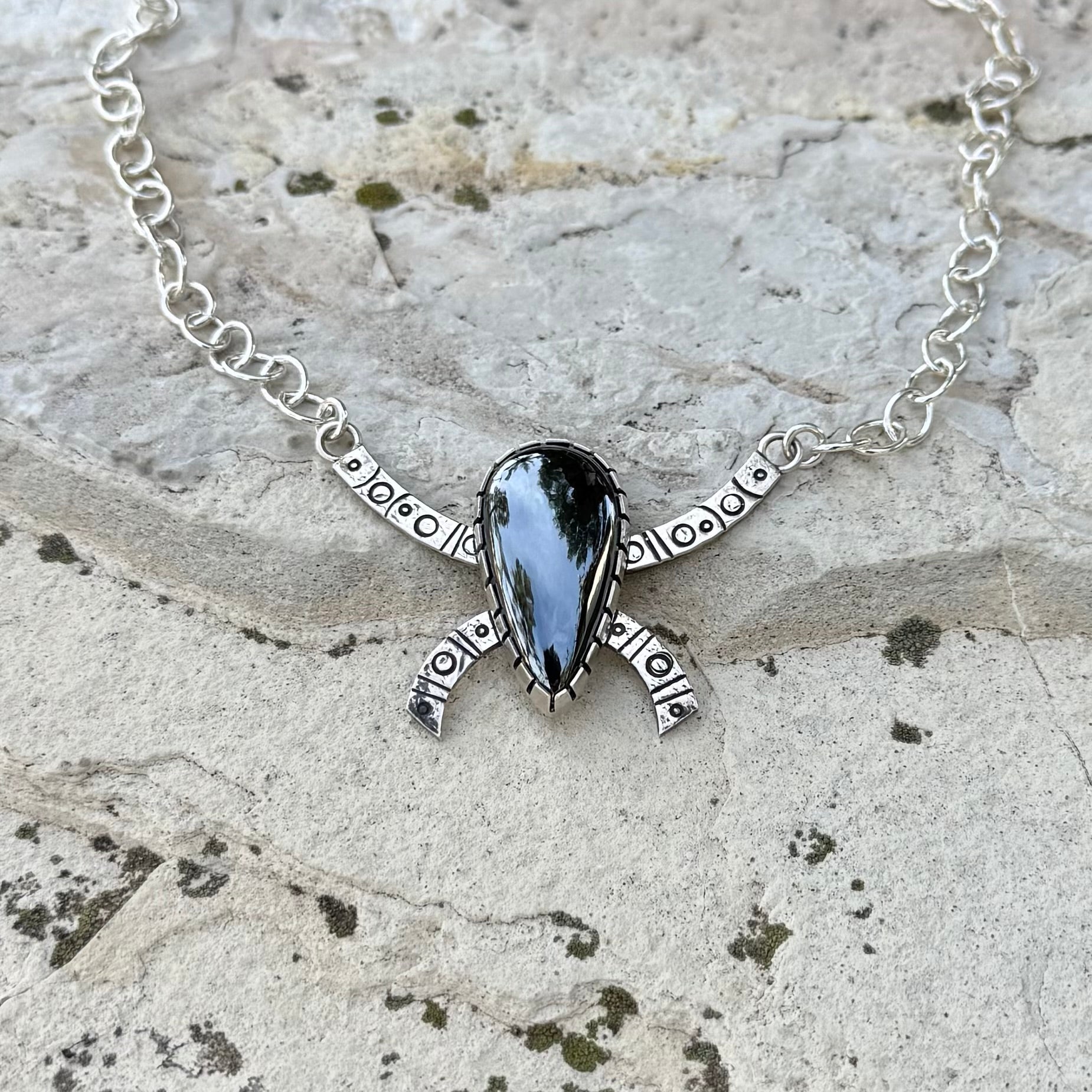 The Iron Matron- a sterling silver necklace features gorgeous hematite, long associated with grounding, strength, and energetic shielding. Its symbolic forms draw from ancient civilizations, resembling a coded language of containment and resolve—embodied, deliberate, and unyielding.