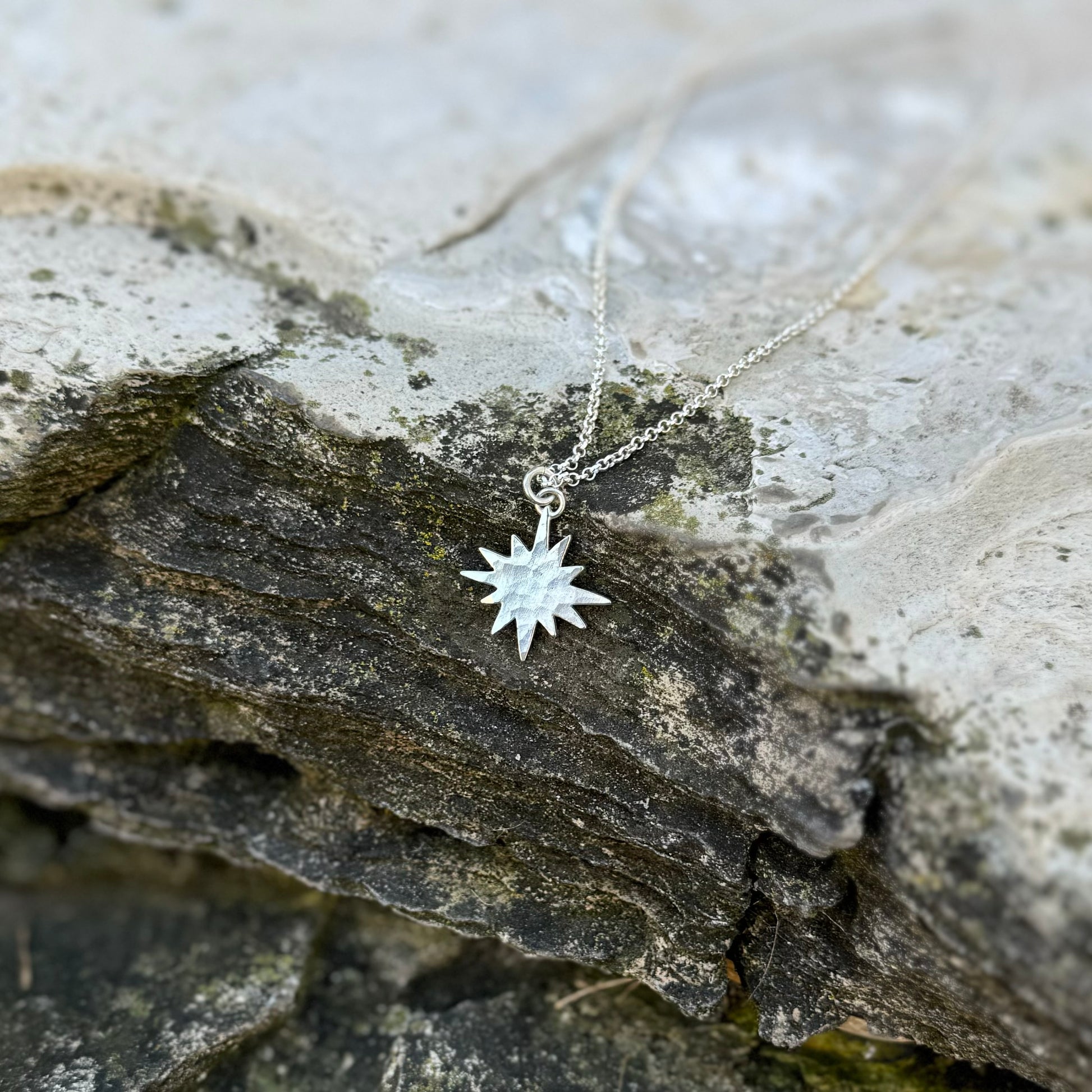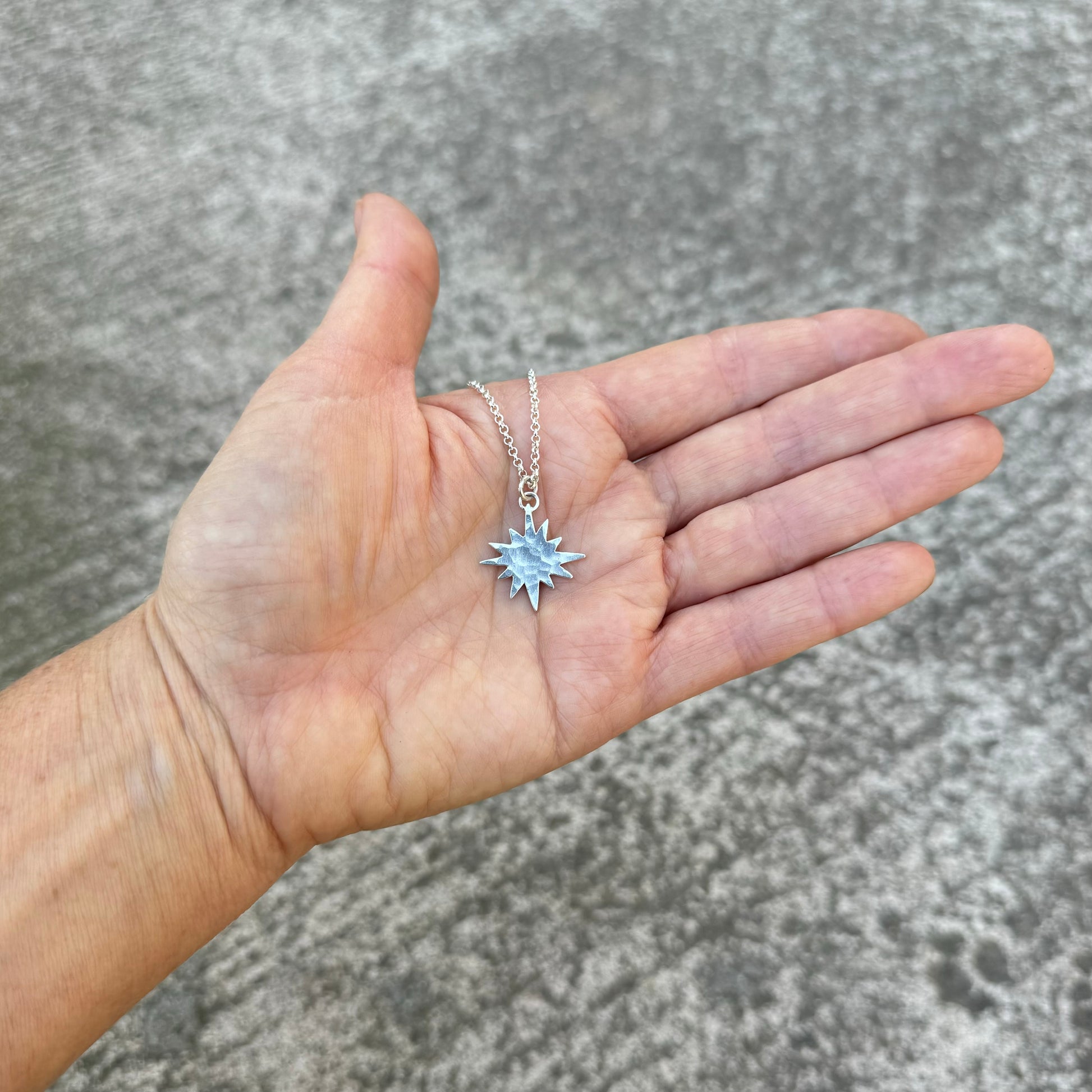 Channel the radiant power of the sun with the Sun Flare Necklace, featuring a striking hammered texture that catches light with every movement. Crafted from sterling silver, this necklace embodies the celestial energy of the sun, bringing warmth, vitality, and a sense of endless possibility to its wearer.